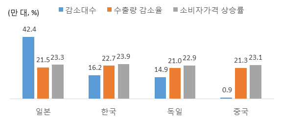 연간 수출 감소 대수는 일본이 42만대, 한국 16만대, 독일 15만대였다. 지난해 미국의 국가별 자동차 수입대수는 일본 196만대, 한국 72만대, 독일 71만대, 중국 4만대였다.