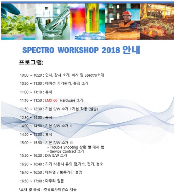 이번 워크숍은 SPECTRO 사의 금속성분분석기 LMX06(모델 MAXx) 장비 사용자를 대상으로 기본 이론에서 장비 실습까지 교육하는 1일 과정이며, 인원이 제한돼 있어 참가 희망자는 사전 등록을 하는 것이 좋다.