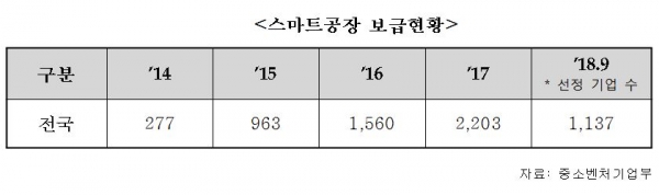 국회 산업통상자원중소벤처기업위원회(이하, 산자중기위) 소속 더불어민주당 어기구의원(충남 당진시)이 중소벤처기업부로부터 제출받은 ‘스마트공장 보급 현황’에 따르면, 2014년부터 지난해까지 4년동안 정부 지원 3,495개, 민간 지원 1,508개 등 총 5,003개의 중소기업에 스마트공장을 지원, 보급했으며, 지원된 예산은 2,669억원에 이른다.