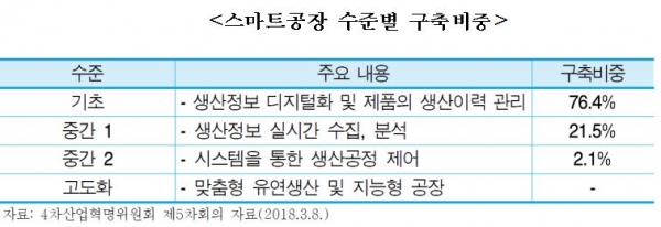 제품 생산 단순 이력관리 수준 기초단계가 76.4%, 생산정보 실시간 수집·분석하는 중간1단계 21.5%