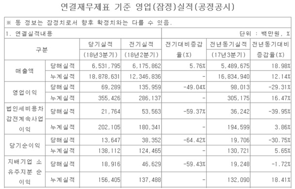 3분기 매출 6조 5,318 억원, 영업이익 693억원 달성