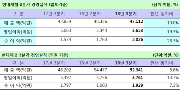 이 같은 실적에 대해 현대제철은 건설시황 둔화 등의 영향으로 전분기 대비 매출액이 소폭 감소했으나 글로벌 프리미엄 판매 확대 등 고부가 제품 마케팅 강화와 전사적인 비용절감을 바탕으로 양호한 실적을 달성했다고 설명했다.