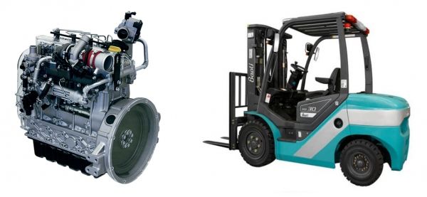 <사진설명> 두산인프라코어가 친환경 고효율 소형 디젤 G2엔진(사진 왼쪽)을 중국 지게차 제조사 바올리에 공급하기로 했다.