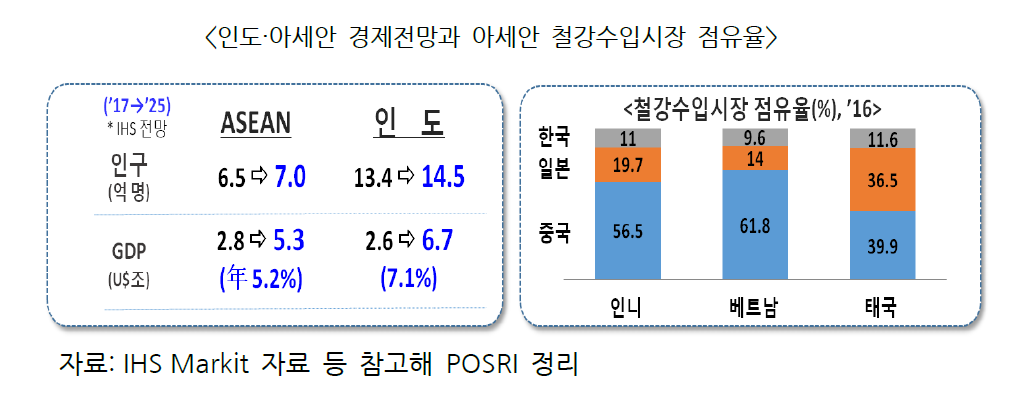 아세안과 인도 시장은 세계에서 가장 빠른 성장지역일 뿐만 아니라 미국의 보호주의 강화로 인해 대안시장으로서 전략적 중요성이 커지고 있는 가운데 앞으로 한국과 중국, 일본 고로사들의 경쟁이 더욱 치열해 질 것으로 예상됐다.