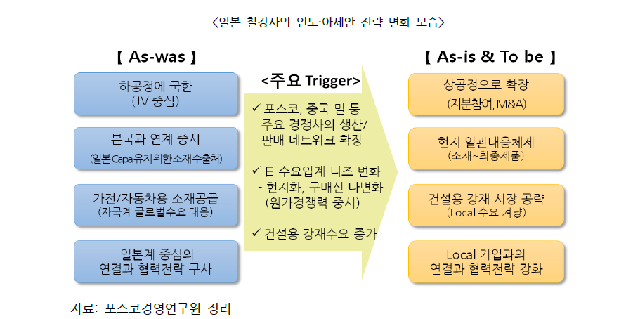 인도·아세안 시장에서의 한중일 3국간 경쟁은 갈수록 치열해지고 있어 일본으로서는 시장의 주도권을 강화할 필요성이 더욱 커지는 상황이다. 아세안 철강수입시장은 일본이 선점하고 있는 시장이지만 중국과 한국의 빠른 추격으로 중국이 아세안 수입시장 점유율에서 일본을 압도하는 추세를 보이고 있다.