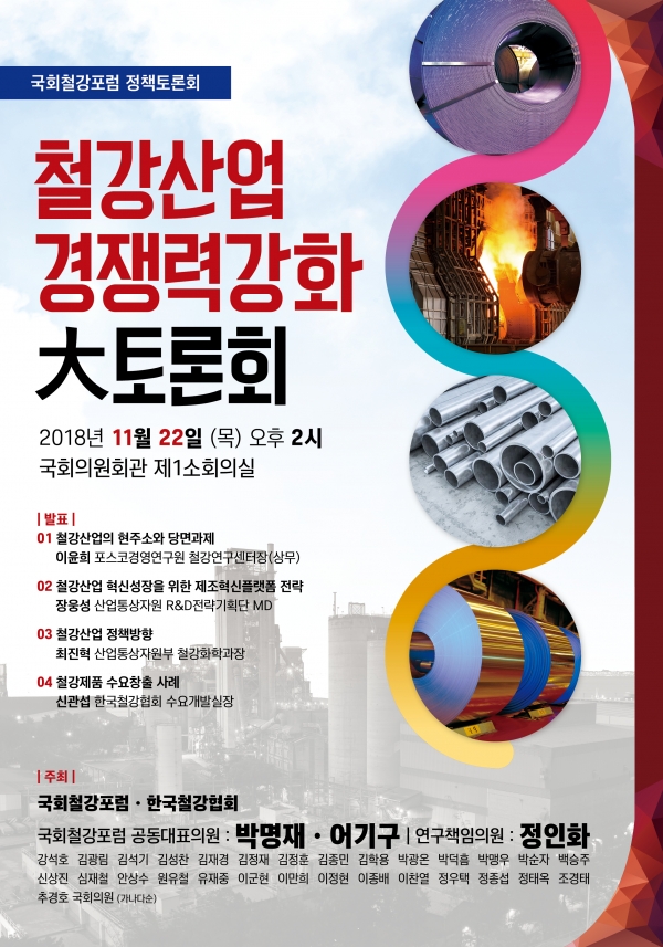 국회철강포럼(공동대표 박명재의원, 어기구의원) 정책토론회가 오는 22일 국회의원회관 제1소회의실에서 열린다.