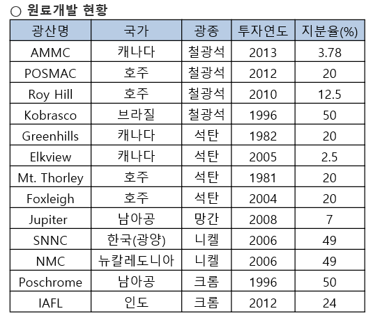 이러한 글로벌 환경의 변화에서 지속적인 경쟁력을 갖추기 위해서는 원료 확보를 위한 투자는 선택이 아닌 필수적인 요인이 되고 있다. 양질의 원료를 얼마나 경쟁력 있게 확보하는지가 경쟁력을 좌우하는 결정적인 역할을 하고 있다는 점에서 앞으로도 원료(철광석, 원료탄 등) 확보 전쟁은 더욱 가속화 될 것으로 예상된다.