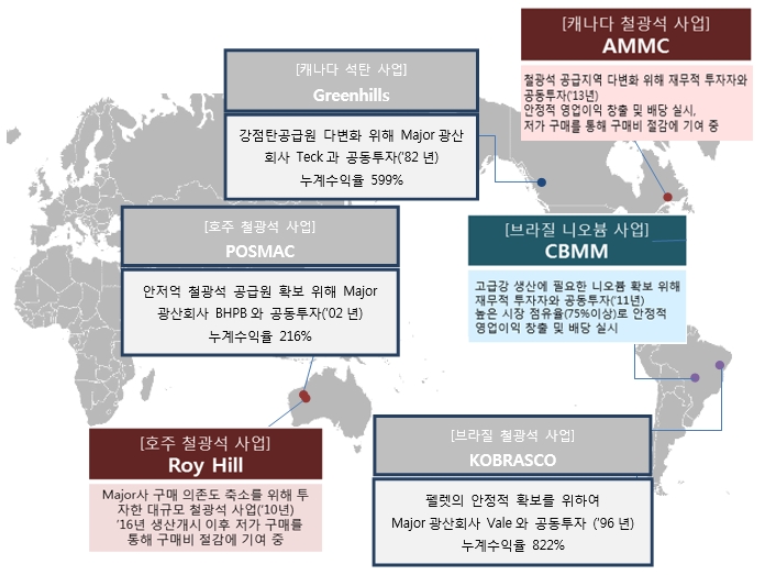 현재 포스코가 보유하고 있는 사업은 총 23건이다. 원료별로는 철광석 6건, 석탄 9건, 제강원료 4건, 스테인리스 4건이다. 지역별로는 호주 7건, 브라질 3건, 캐나다 3건, 미국 2건, 인도네시아1건, 아프리카 4건, 뉴칼레도니아 1건, 인도 1건, 한국 1건이다.