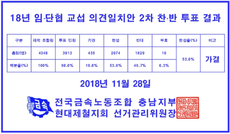 2018년 임단협 교섭 의견일치안 2차 찬반 투표결과 '가결' 금속노조 소속 현대제철 당진지회가 사측과 진행한 교섭안이 조합원 투표에서 53% 찬성률로 통과 됐다고 지난 28일 밝혔다. 이로 인해 철강업계가 우려했던 3차 파업은 진행되지 않는다. 윤철주 기자 cjyoon@snmnews.com 다른 기사 보기 관련기사 현대제철 당진공장, 3차 파업 30일 ‘판가름’ 현대제철, 당진공장 2차 파업 종료…3차 파업 예정? 현대제철 당진공장 파업에 대상업체 ‘분주’ 현대제철, 車경량화에 맞춘 조관 설비 구축 현대제철, 헌혈을 통한 ‘생명 나눔’ 저작권자 © 철강금속신문 무단전재 및 재배포 금지