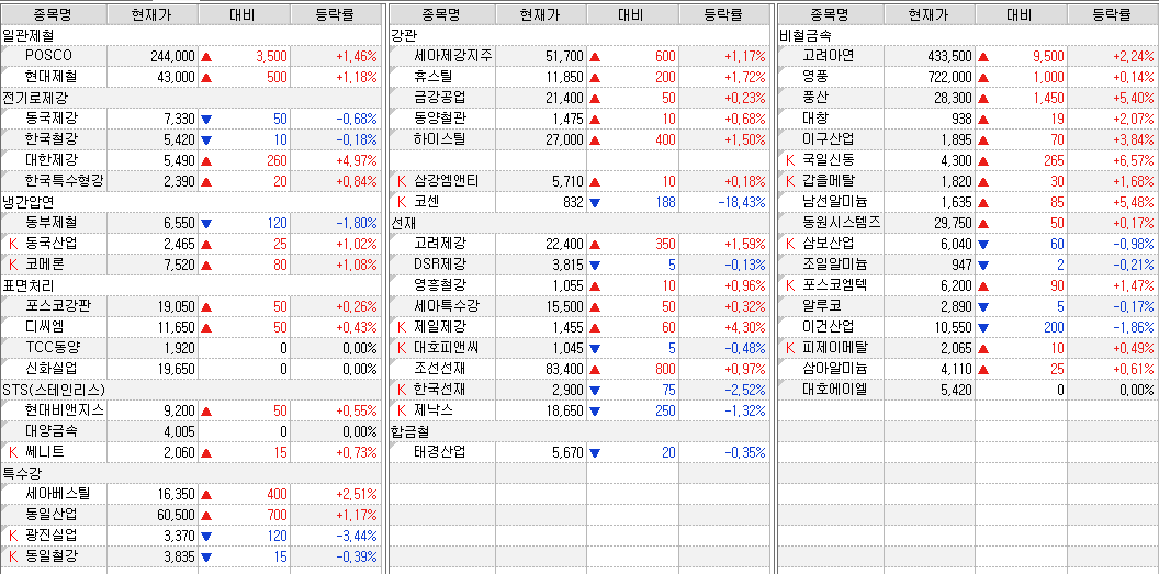 철강ㆍ비철금속 업체 주가 동향 (29일 종가 기준)