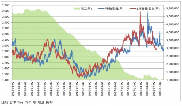 이런 가운데 지난달 말부터 증가세를 이어오던 LME 알루미늄 재고가 최근 다시 12거래일 연속 감소하면서 100만톤을 하회할 가능성이 높아진 상황이다. LME 알루미늄 12월 평균 가격은 현물이 톤당 1,978달러, 3개월물이 톤당 1,976.8달러로 전월 평균 가격 대비 각각 40.3달러, 26.8달러 상승했다.