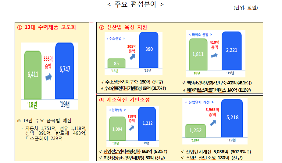 분야별로 보면 산업단지 스마트화 등 제조혁신분야, 에너지전환·복지·안전, 통상·무역고도화, 지역경제 활성화 예산이 확대 편성됐다.