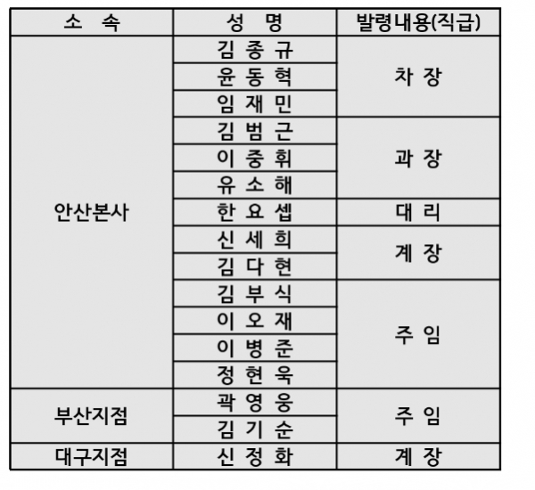 아래 인사 가운데 차장급과 과장급, 대리급, 계장급, 주임급 승진 인사는 아래와 같다.