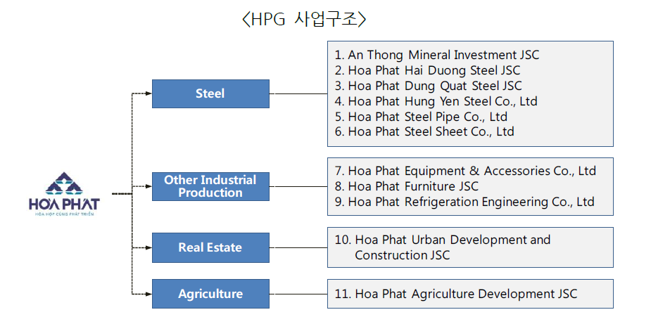 HPG(Hoa Phat Group)는 베트남 최대 건설용 강재(철근∙파이프) 업체로 압도적인 시장 지배력 보유하면서 베트남 철강산업의 맹주로 부상했다.