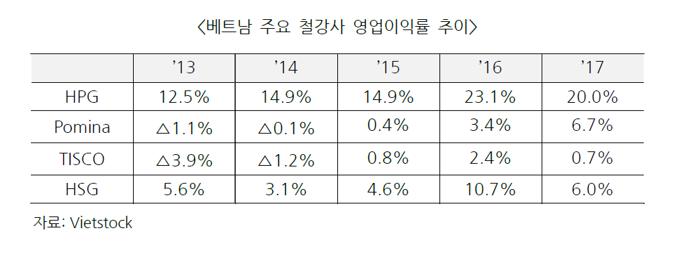 HPG는 베트남 최대 건설용 강재 업체로 시장점유율이 철근ㆍ선재 21%, 파이프 26%로 압도적인 1위를 차지하고 있다. 특히 원가 우위, 시장 지배력으로 경쟁사 대비 압도적 경영실적을 보이고 있다. 2017년 기준 영업 이익률은 20%를 기록해 2위 Pomina 6.7%, 3위 TISCO 0.7%에 비해 큰 차이를 나타내고 있다.