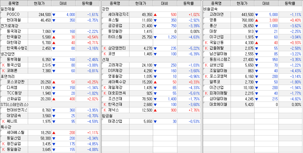 철강ㆍ비철금속 업체 주가 동향 (26일 종가 기준)