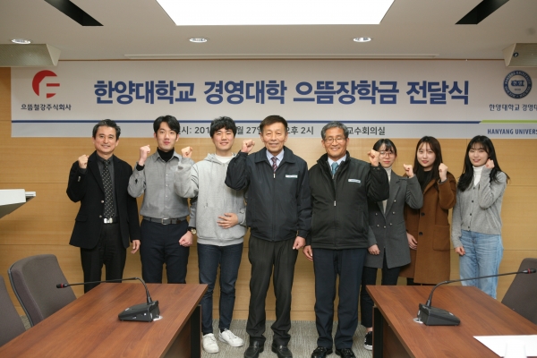 이날 전달식에는 으뜸철강 황상돈 대표를 비롯한 임직원들과 한양대학교 유규창 경영대학장, 송창준 학부장 및 장학금 수혜 학생 5명이 참석했다.