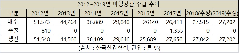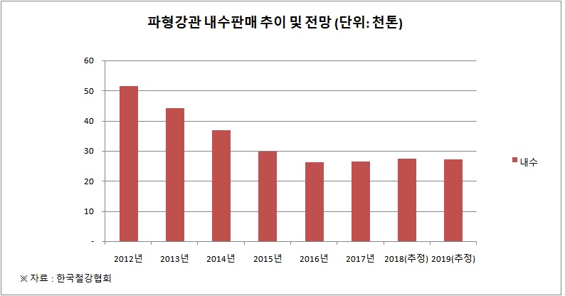 한국철강협회에 따르면 파형강관은 지난 2012년 전체 내수 판매량이 5만1,573톤을 기록한 이후 지속적으로 감소해왔다. 지난 2013년에는 4만4,560톤, 2014년 3만6,109톤, 2015년 2만9,646톤을 기록했다. 이어 2016년 2만5,689톤, 2017년 2만7,650톤으로 조사됐다.