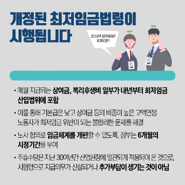 따라서, 내년에는 개정 최저임금법의 취지에 따라 임금체계를 합리적으로 개편하기 위해 노사 모두가 노력할 것으로 기대되며, 정부도 이를 적극 지원할 것이다.