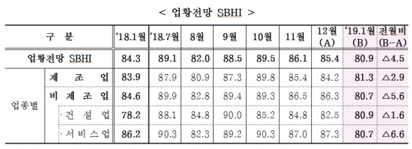 제조업의 2019년 1월 경기전망은 전월보다 2.9p 하락한 81.3으로 조사되었고, 비제조업은 전월보다 5.6p 하락한 80.7로 조사되었다. 건설업은 1.6p 하락하여 4개월 연속 하락세를 보였고, 지난달에 살짝 반등하였던 서비스업 역시 6.6p 하락하였다.