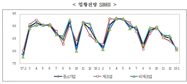 중소기업중앙회(회장 박성택)가 지난 12월 14일부터 12월 20일까지 3,150개 중소기업을 대상으로 ‘2019년 1월 중소기업경기전망조사’를 실시한 결과, 업황전망 중소기업건강도지수(SBHI)가 전월보다 4.5p 하락하고 전년 동월 대비 3.4p 하락한 80.9로 조사되어 3개월 연속 하락한 것으로 나타났다.