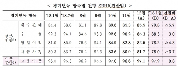 수출전망(85.3→88.3)이 유일하게 상승하였고, 내수판매전망(85.5→79.8), 영업이익전망(82.5→78.2), 자금사정전망(81.7→78.0)은 모두 하락하였으며, 역추세인 고용수준전망(97.1→97.9)은 다소 상승한 것으로 나타났다.
