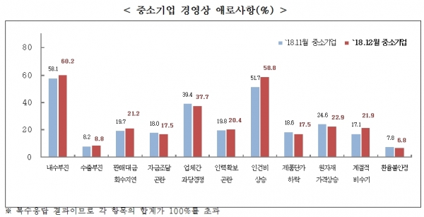 2018년 12월 중소기업의 경영애로(복수응답) 응답을 살펴보면 지난달에 이어 ‘내수부진’(60.2%)이 최다 경영애로사항으로 조사되었다. 이어 전월보다 크게 상승한 ‘인건비 상승’(58.8%), ‘업체 간 과당경쟁’(37.7%), ‘원자재 가격상승’ (22.9%) 순으로 나타났다.