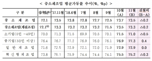 2018년 11월 중소제조업 평균가동률은 지난달보다 다소 하락한 73.5%로 나타났다. 전월 대비 0.2%p 하락하고 전년 동월과 동일하였다. 이중 소기업은 전월 대비 0.5%p 하락한 71.0%인 반면, 중기업은 0.4%p 상승한 77.3%로 나타났다. 계절조정지수 역시 지난달보다 0.2%p 하락한 73.3%를 기록했다.