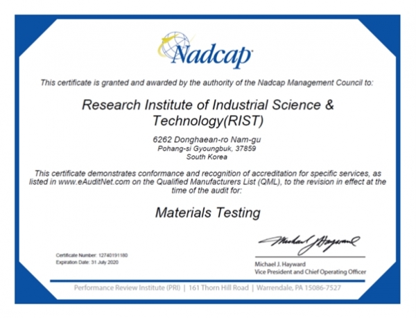RIST(포항산업과학연구원, 원장 유성)가 국내에서 처음으로 항공용 금속소재 시험분야의 NADCAP(National Aerospace and Defense Contractors Accreditation Program) 독립 시험기관으로 인정 받았다.