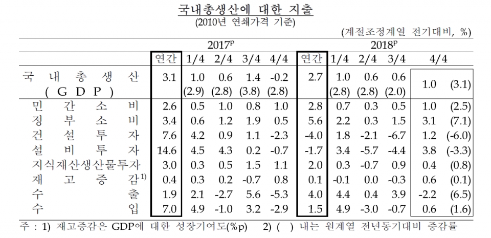반면 건설투자(-4.0%)는 외환위기 이후 20년 만에 가장 부진했다. 설비투자(-1.7%)는 글로벌 금융위기 이후 9년 만에 최저였다. 지식재생산물투자(2.0%)도 3년 만에 증가율이 가장 낮았다.