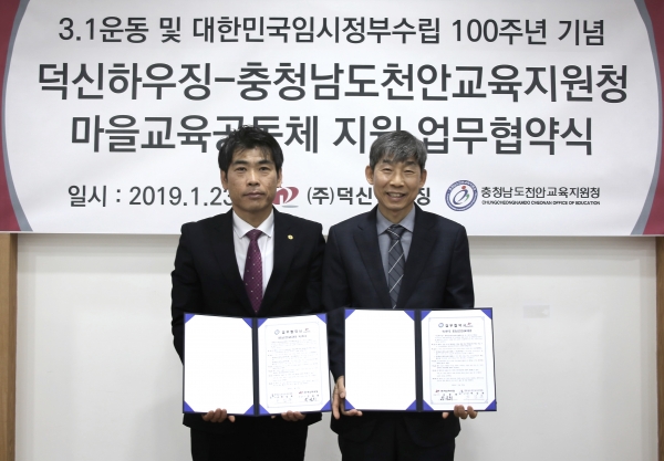 건축용 데크플레이트 글로벌 1위 기업 덕신하우징(회장 김명환)은 23일 충청남도 천안교육청과 마을교육공동체 지원사업을 위한 업무협약(MOU)을 체결했다고 24일 밝혔다.