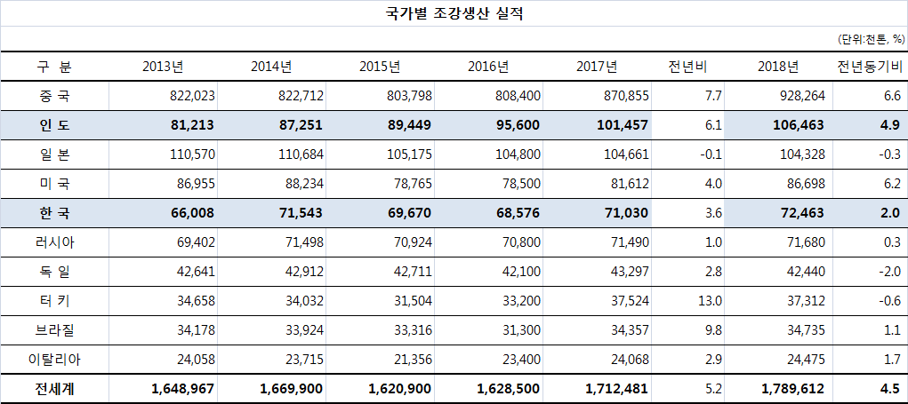 2018년 세계 조강생산이 전년대비 4.5%나 증가한 가운데 우리나라가 러시아를 제치고 조강생산국 5위에 올라섰다.