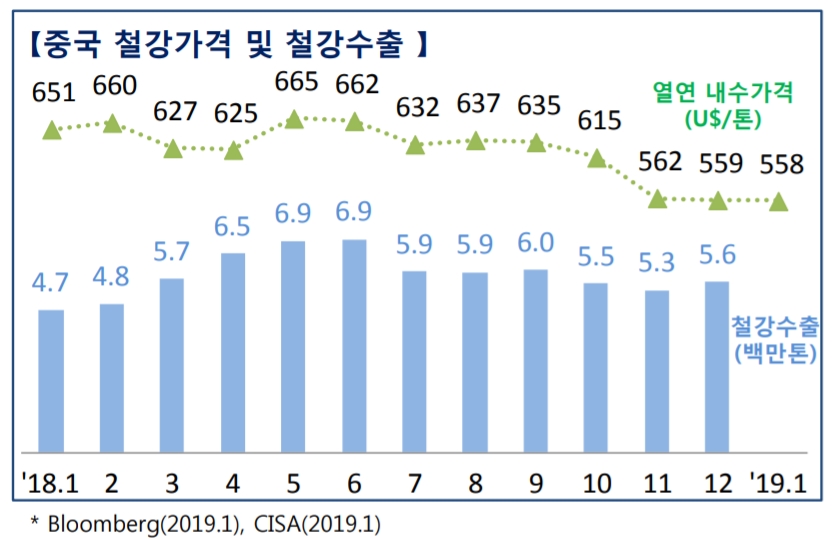 아울러 중국 정부가 자국 경제 둔화에 대응하는 과정에서 환경규제가 완화돼 예상보다 철강 감산 규모가 더 축소됐다고 평가했다. 단 공급 확대에도 불구하고 중국산 철강 수출은 지난해 대비 4.2% 감소했다고 밝혔다.