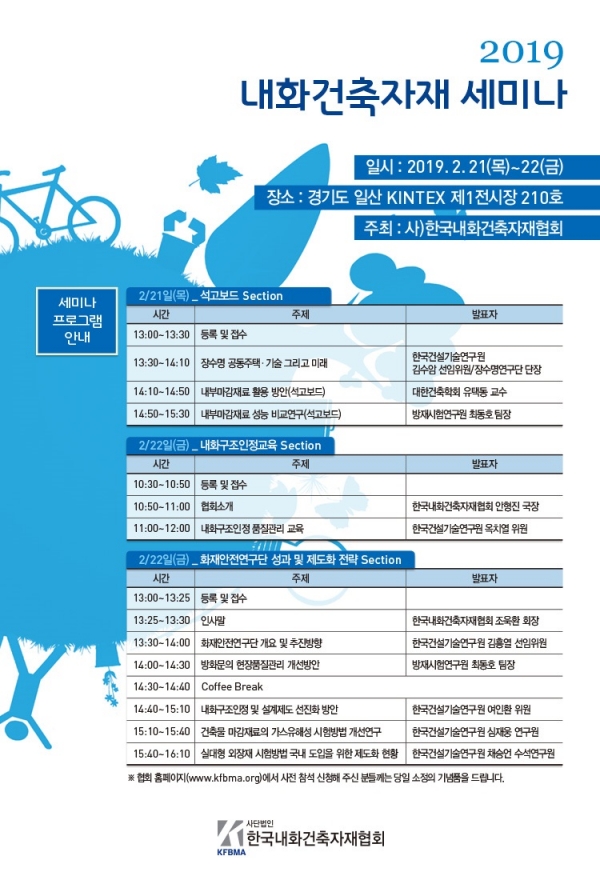 한국내화건축자재협회(회장 조욱환)은 오는 2월 21일과 22일 이틀에 걸쳐 일산 킨텍스에서 ‘2019 내화건축자재 세미나’를 개최한다.