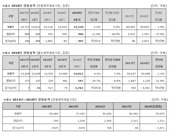 연결기준 4분기 영업이익은 전년 동기대비 18.0% 감소한 466억원을 기록하며 2015년 2분기 이후 15분기 연속 영업 흑자를 이어나갔다. 매출은 1조5,510억원, 순이익은 497억원 적자를 기록했다.