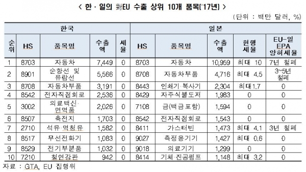 우리나라와 일본은 對EU 수출품목이 유사해 이 협정 발효에 관심이 집중되고 있다. 특히 양국 모두 동 총 수출의 50% 이상이 중간재, 15% 가량이 자동차로 이들 품목은 EU시장에서 한·일간 경합 품목으로 꼽히고 있다. 이들 품목을 중심으로 한·일 양국의 對유럽 수출규모는 약 1,337억 달러 규모(2017년 기준)이며, 특히 자동차 및 부품, 기계 등은 일본이 특혜관세를 통해 EU시장에 들어오게 됨으로써 관세철폐 기간이 끝나는 5-7년 후에는 우리와 마찬가지로 무관세를 적용받게 된다.