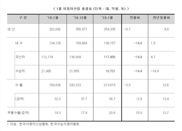 19일 산업통상자원부에 따르면 1월 국내 자동차 생산량은 신차 출시와 2월 설 연휴에 대비한 조기생산 등의 영향으로 전년 동월 대비 9.8% 증가한 35만4,305대를 기록했다.