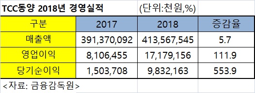 표면처리 전문업체인 TCC동양(대표 손봉락, 조석희)이 지난해 연결기준 영업이익이 171억7915만원을 기록해 전년 대비 111.9% 증가했다고 26일 공시했다.