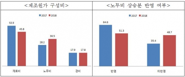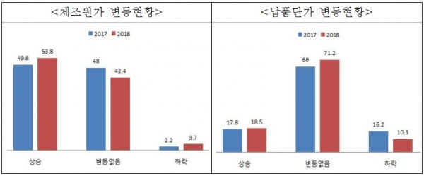 제조원가(재료비, 노무비, 경비)가 상승한 업체는 53.8%인 반면 납품단가가 올랐다고 응답한 업체는 18.5%에 불과했으며, 이는 전년도(2017년)와 비교했을 때 각각 4.0%p, 0.7%p 상승한 수치다.