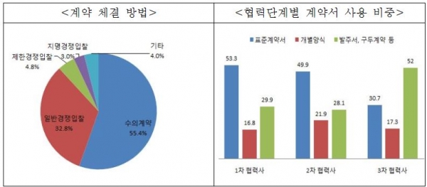 하도급거래와 관련해 계약 체결 방법은 ▲수의계약(55.4%) ▲일반경쟁입찰(32.8%) ▲제한경쟁입찰(4.8%) 순으로 많았으며, 사용하는 계약서는 ▲표준하도급계약서(52.0%) ▲발주서·이메일 등(28.8%) ▲개별양식(17.7%) 순으로 조사됐다.
