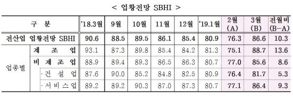 제조업의 2019년 3월 경기전망은 전월보다 13.6p 상승한 88.7, 비제조업은 전월보다 8.6p 상승한 85.6으로 조사되었다.
