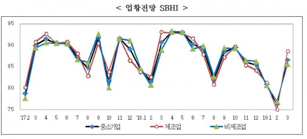중소기업중앙회(회장 박성택)가 지난 2월 15일부터 21일까지 3,150개 중소기업을 대상으로 ‘2019년 3월 중소기업경기전망조사’를 실시한 결과, 업황전망 경기전망지수(SBHI)가 전월 대비 10.3p 상승한 86.6로 나타나며 5개월 만에 반등했다.