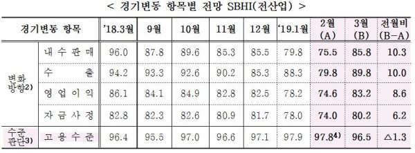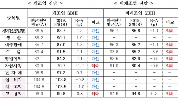2019년 3월의 SBHI와 최근 1년 항목별 SBHI 평균치와 비교해보면 제조업에서는 자금사정과 고용 전망을 제외한 경기전반, 생산, 내수, 수출, 영업이익 전망 등에서는 평균치를 소폭 상회한 반면, 비제조업에서는 내수판매, 수출, 영업이익, 고용전망 등 모든 항목에서 여전히 평균치에 미치지 못하는 것으로 나타났다. 제조업의 설비·재고 전망은 100을 초과함에 따라 과잉상태를 보이고 있다.