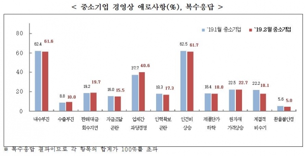 2019년 2월의 중소기업의 경영애로(복수응답) 응답을 살펴보면 2019년 적용 최저임금 인상 영향으로 인하여 ‘인건비 상승’(61.7%)이 지난달에 이어 ‘내수부진’(61.6%)을 근소하게 제치고 최다 경영애로사항으로 조사되었다. 이어 ‘업체 간 과당경쟁’(40.6%), ‘원자재 가격상승’(22.7%) 순으로 나타났다.