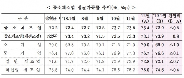 2019년 1월 중소제조업 평균가동률은 전월보다 0.5%p 하락한 72.9%로 나타났으나 전년 동월보다는 0.5%p 상승하였다. 이 중 소기업은 전월 대비 1.0%p 하락한 69.0%, 중기업은 0.1%p 하락한 76.6%로 조사되었다. 계절조정지수는 원지수와는 차별화를 보여 지난달(12월) 보다 0.8%p, 전년 동월보다 0.5%p 상승한 73.9%를 기록하였다.