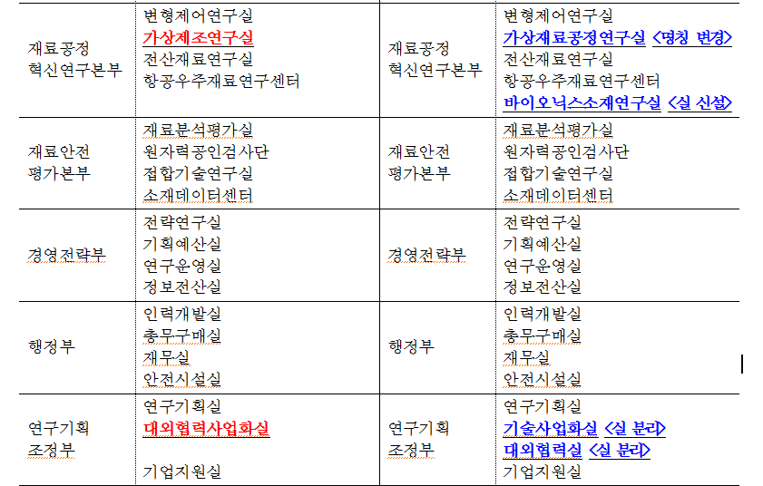 우선 재료공졍혁신연구본부 가상제조연구실을 가상재료공정연구실로 명칭을 변경했고 바이오닉스소재연구실을 신설했다.