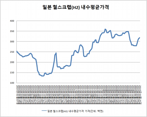 일본 철스크랩 내수 평균 가격이 7주 연속 상승세를 이어갔다.