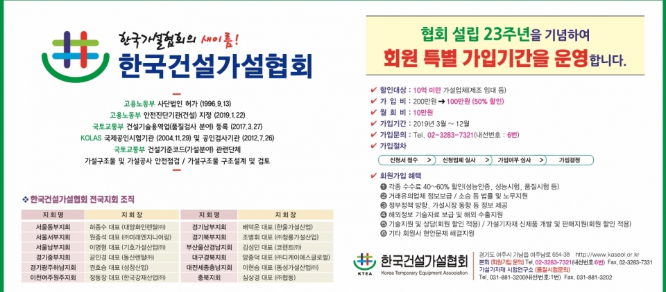 협회에 따르면 할인대상은 10억 미만의 가설업체(제조, 임대)로 가입비를 기존 200만원에서 100만원으로 50% 할인한다. 월회비는 10만원으로 낮췄다. 가입기간은 2019년 3월부터 12월까지다.