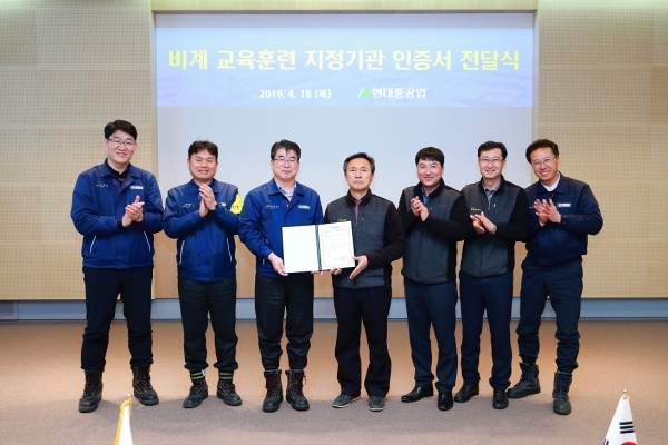 현대중공업은 비계기술원의 조선소 제1호 비계교육 인증기관 지정을 기념하여 18일 울산 '통합안전교육센터'에서 현판식 행사를 가졌다.