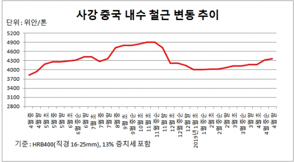 4월 말 사강 철근 판매價 톤당 4,370위안…3월 말 대비 톤당 200위안↑